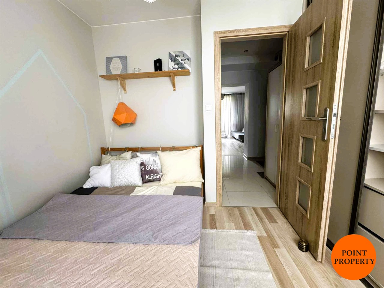 W salonie min rozkładana kanapa, stół z krzesłami, zabudowa kuchenna, biurko. W sypialni wygodne łóżko oraz przestronna szafa w zabudowie. W łazience glazura i terakota, kabina prysznicowa oraz pralka.