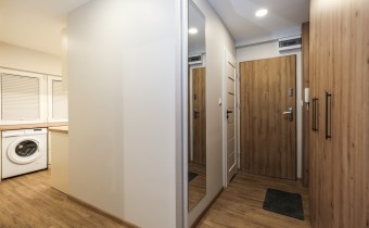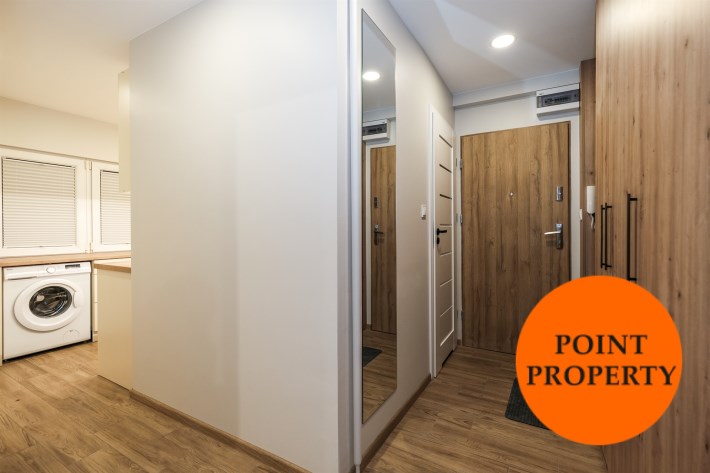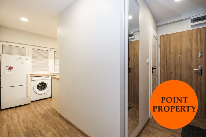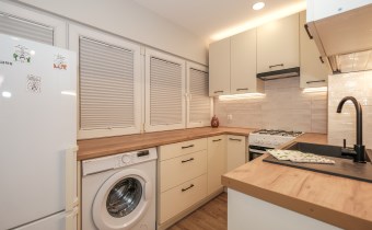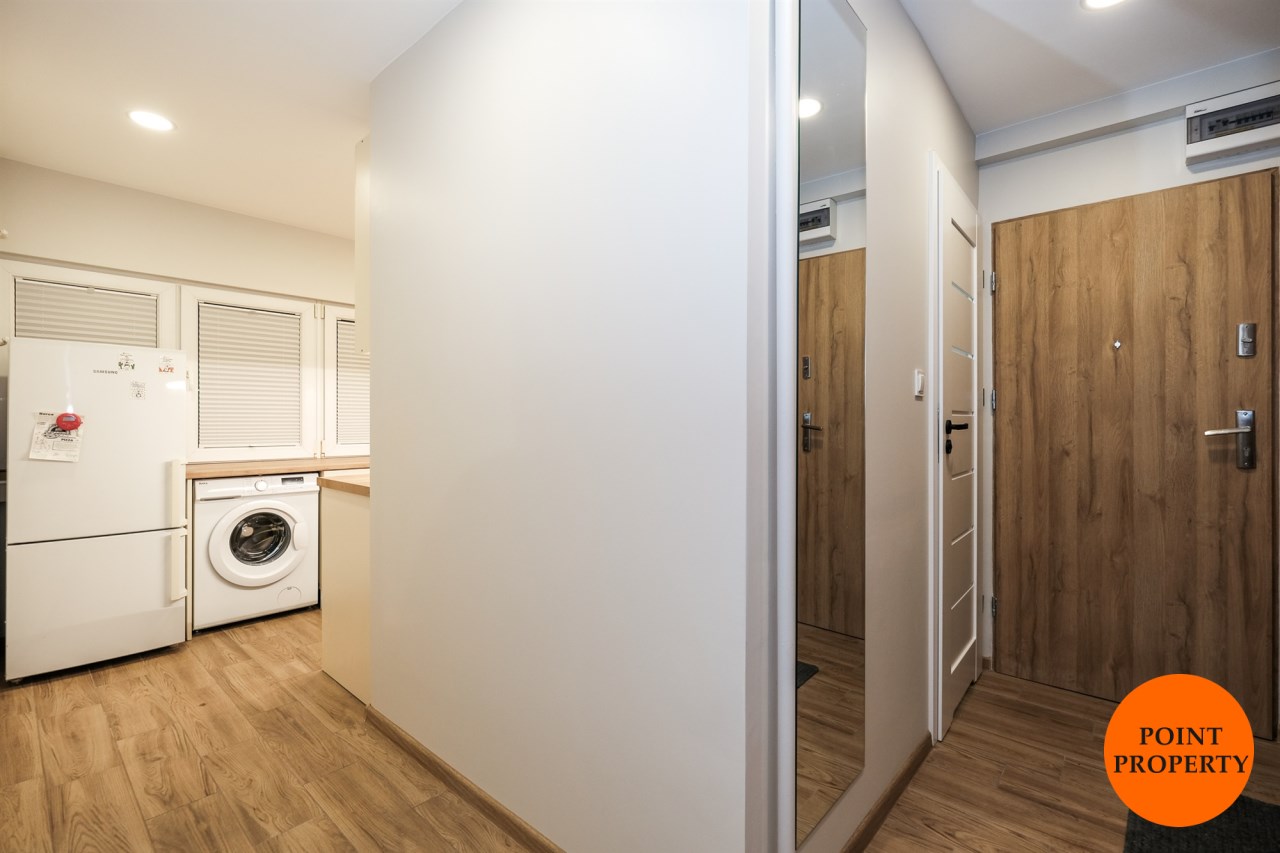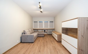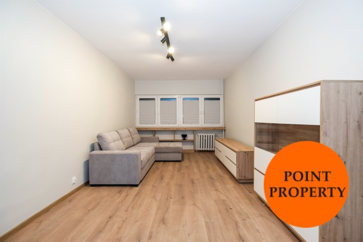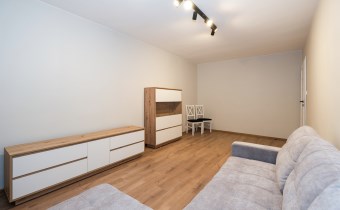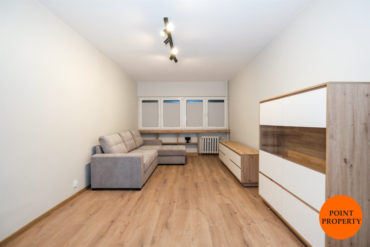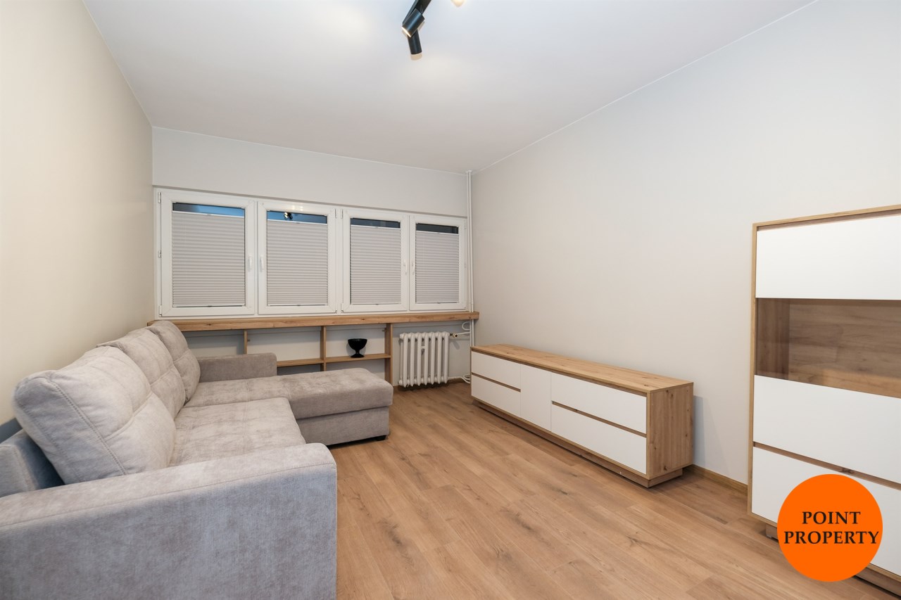 Mieszkanie częściowo umeblowane i wyposażone. W części wypoczynkowej (duży pokój) nowa, rozkładana kanapa naroża, stół z krzesłami, komody. W kuchni meble plus lodówka, zmywarka, kuchenka gazowa z piekarnikiem.