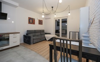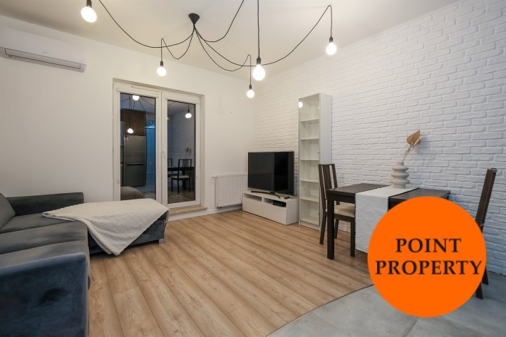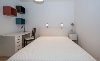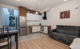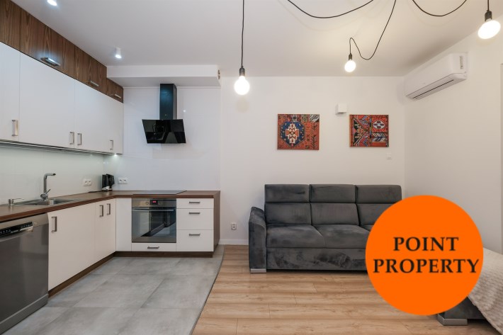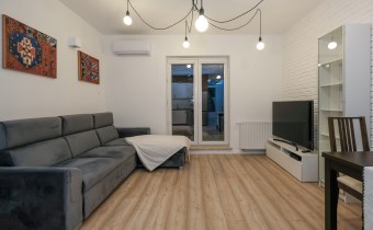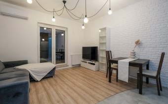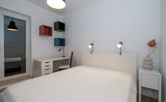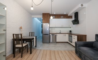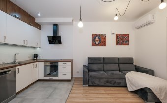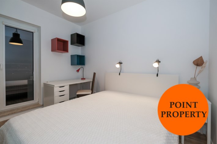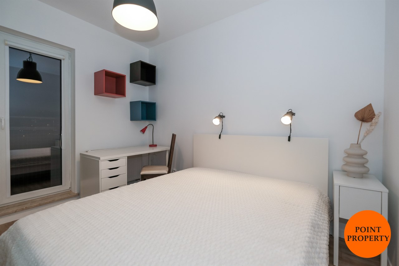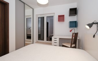 Prezentowane mieszkanie składa się z: salonu, wyposażonego w wygodną kanapę, połączonego z aneksem kuchennym (kuchnia w pełni wyposażona m.in. w zmywarkę, lodówkę, płytę indukcyjną, piekarnik), sypialni z podwójnym łóżkiem i pojemną szafą. Dodatkowo salon posiada wyjście na balkon z widokiem na miasto.