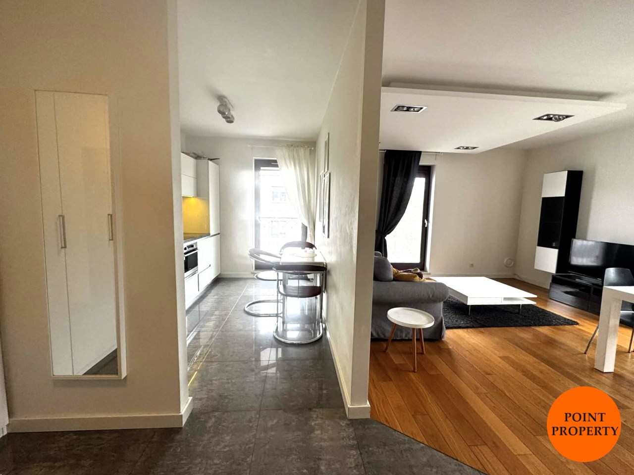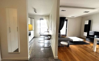 Apartament urządzony nowocześnie, charakteryzuje go przestrzeń oraz jasna kolorystyka.