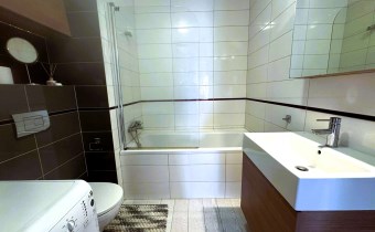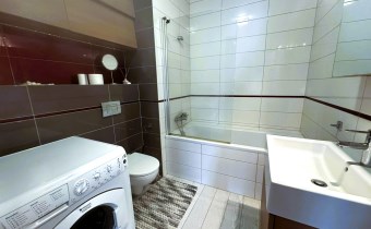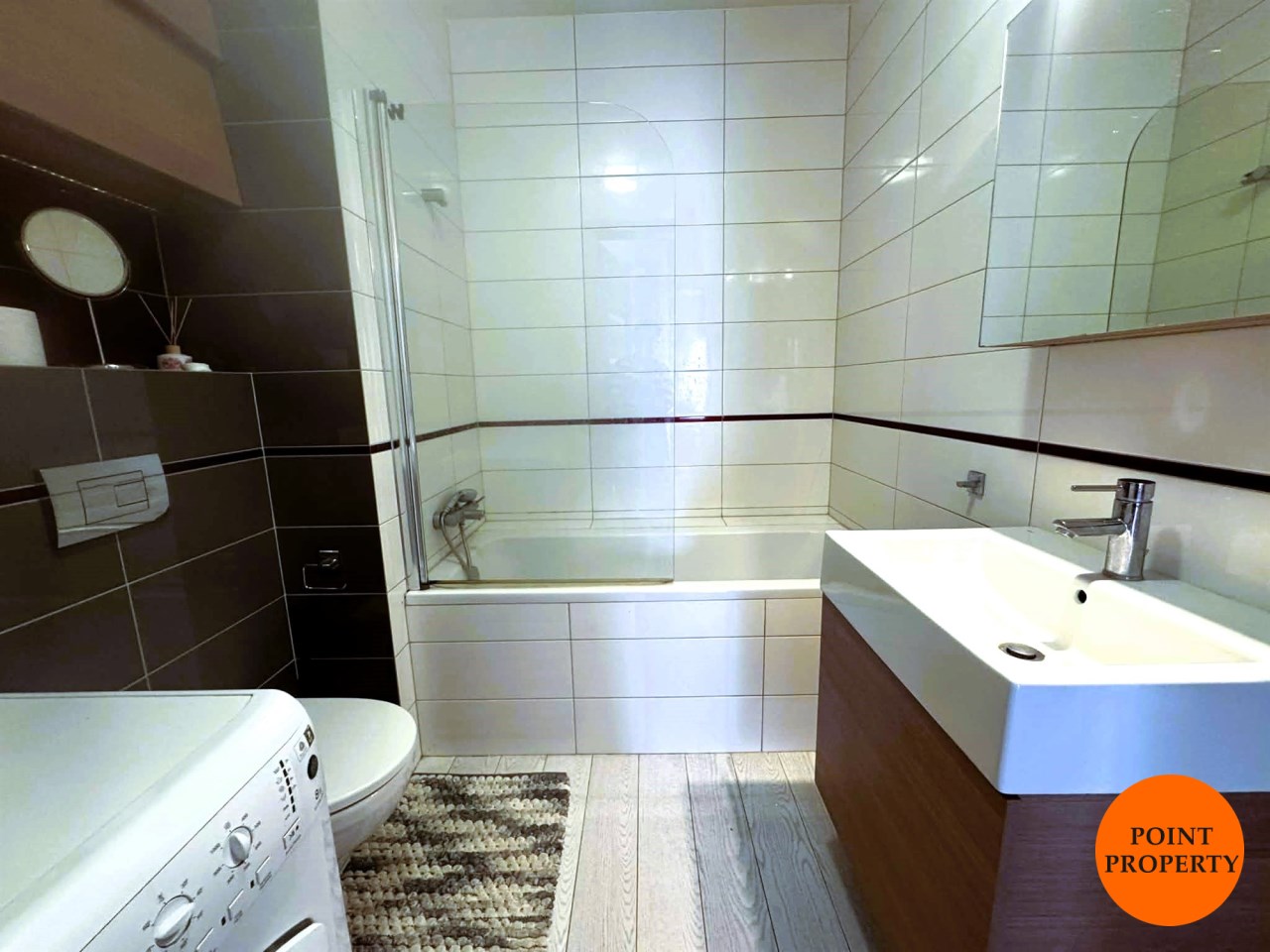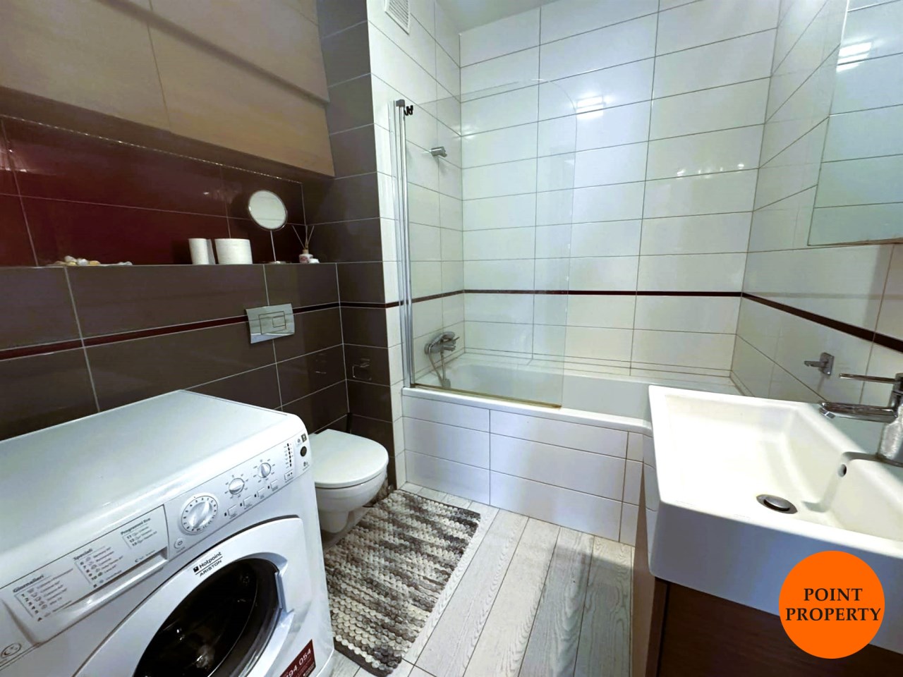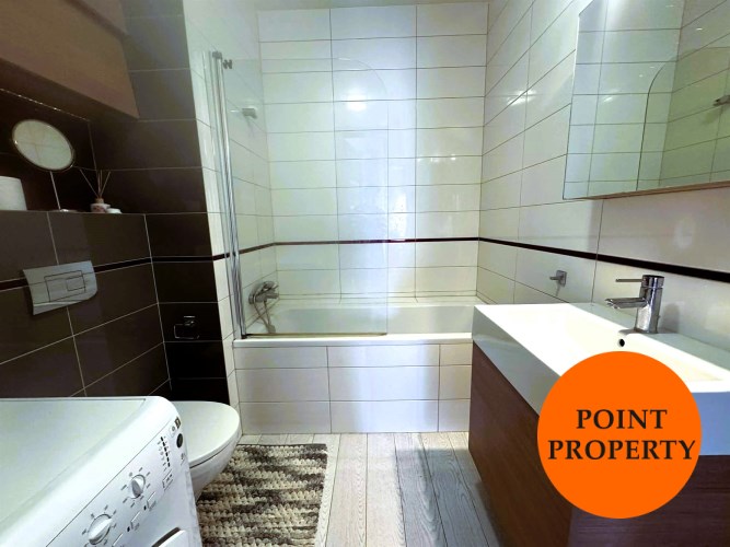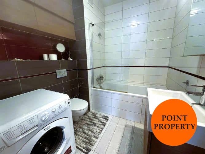 Jest umeblowane i wyposażone: w kuchni znajdują się min. lodówka, piekarnik, zmywarka. W salonie rozkładana kanapa narożna. W sypialni łóżko 140 cm, szafa. Sporej wielkości łazienka z min kabiną prysznicową, pralką.